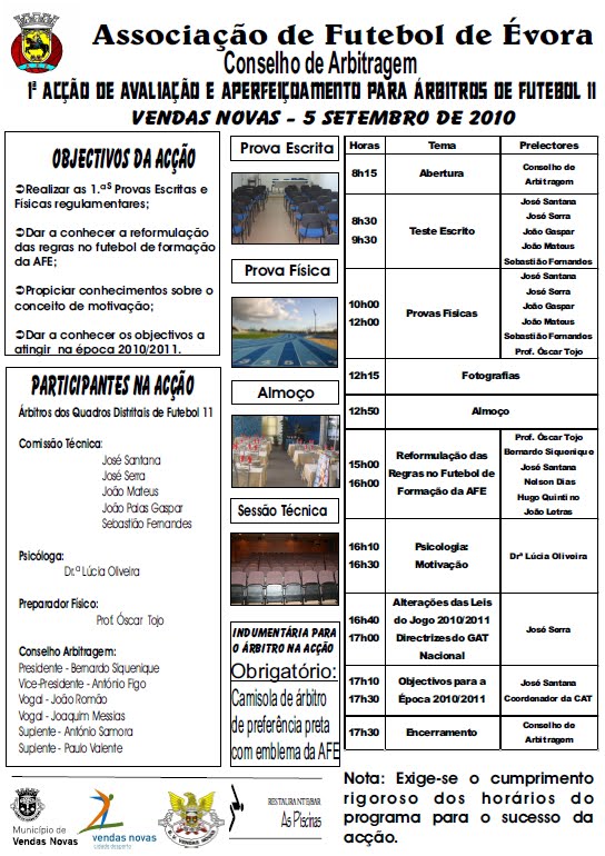 CONVOCAM-SE OS ÁRBITROS DOS QUADROS DISTRITAIS DE FUTEBOL DE 11, DO CONSELHO DE ARBITRAGEM DA ASSOCIAÇÃO DE FUTEBOL DE ÉVORA PARA SE APRESENTAREM NO DIA 5 DE SETEMBRO DE 2010, NO COMPLEXO DESPORTIVO MUNICIPAL, EM VENDAS NOVAS, PELAS 8.00 HORAS A FIM DE PRESTAREM PROVAS ESCRITAS E FÍSICAS DE INÍCIO DE ÉPOCA 2010/2011, CONFORME PROGRAMA EM BAIXO.